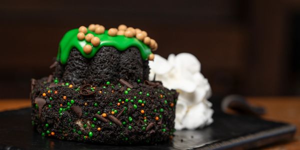 caramel cheesecake with a graham cracker and chocolate chip crust, coated in chocolate flakes, topped with guinness stout-infused fudge cake, covered in ganache and caramel crisps