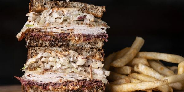house smoked turkey, deli style pastrami, swiss cheese, apple slaw, russian dressing, toasted marble rye