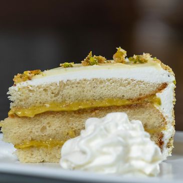 light chiffon cake, soaked with a honey simple syrup, layered with pistachio mousse, covered in a white chocolate glaze, whipped cream $6.99