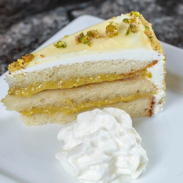 light chiffon cake, soaked with a honey simple syrup, layered with pistachio mousse, covered in a white chocolate glaze, whipped cream $6.99